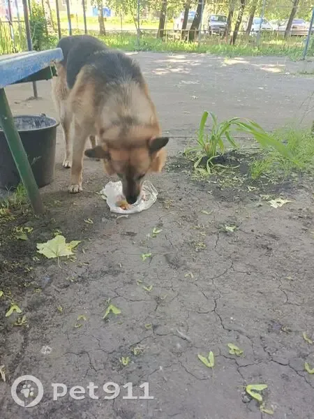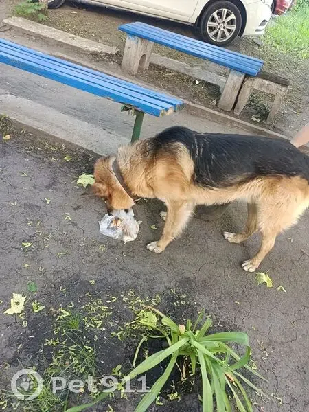 Овчарка, черно -коричневого цвета, на щеке ошейник с красной отстрочкой. Очень воспитание, добрый, легко идёт на контакт с детьми. 25.05 весь день бегал с тревогой во дворе, сегодня подружился с местной детворой и не отходит от них.