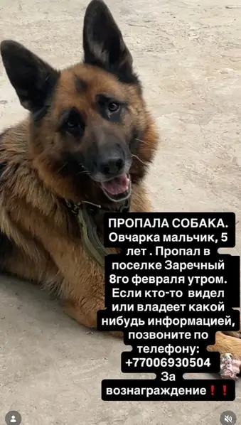 Найдена Немецкая овчарка с ошейнком, примерно 2 года, кобель. Был на трассе у поворота на Березовую рощу, искал свою машину.