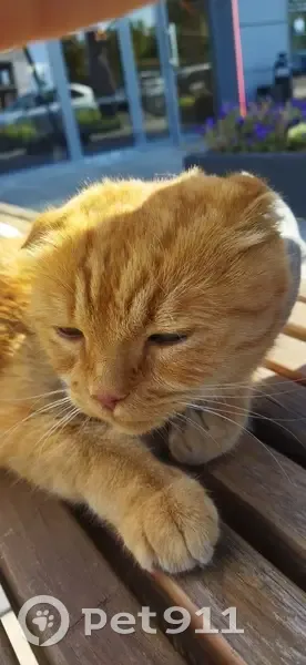 Кот рыжий, вроде вислоухий, в ошейнике из фет...