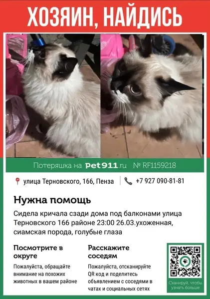 Пропала кошка, найден сиамский кот в районе 13 гимназии