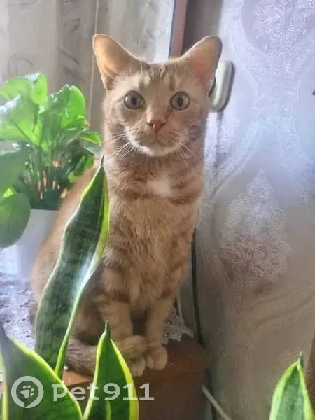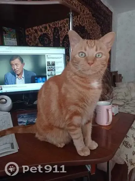 Окрас рыжий, с полосами и узорами на спине. Общительный, легко идëт к людям, даже к незнакомым, любопытный. Судя по всему, выскочил в открытую дверь и увязался за выходящими из подъезда людьми.