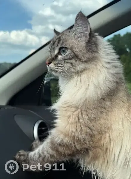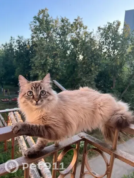 2 года порода Невская Маскарадная голубые глаза, очень пушистый хвост, на ушках кисточки небольшие. Очень ласковая. Но пугливая. Вышла погулять в подъезд, залезла на чердак и больше не вернулась.