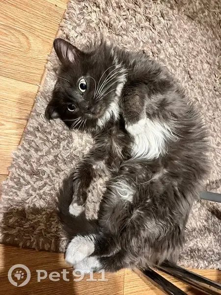 Длинношерстный серого цвета лапки и грудь белые, глаза зеленые. Крупного телосложения, длинный хвост. Не контактный, боится чужих людей. Вышел погулять и не вернулся.