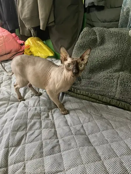 Пропал котик породы Канадский сфинкс, возраст 1,2г.Котик исключительно домашний, улицу не знает. Район города: Арбеково, ул Одесская/Минская/Ульяновская. Окрас персик с серым оттенком, носик чёрный, контур ушек черный, на ногах "носочки". Просим вернуть за вознаграждение, котик очень важен нашей семье! 😭Тел. для связи: 89875193652
