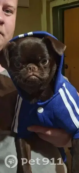 Цвет Тёмно коричневый, шоколадный. Пропала собака в Ахунах!!! 7 февраля в 13:00 выпустила погулять двух маленьких собак, йорк и пти-брабансон. Пока я убирала снег они бегали по улице Снайперская. Через 10 минут йорк вернулся, а пти-брабансон нет. Пропавший щенок очень добродушный и не боится подходить к людям. Скорее всего кто-то подобрал, так как они всегда возвращались вместе. На ошейнике есть мой номер телефона и адрес, но нам так никто не позвонил.
