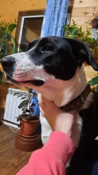 Собака охотничьей породы Куцхар. Белая с черным. Собака молодая.Пришла в деревню через речку со стороны трассы.