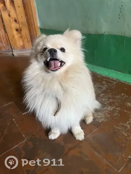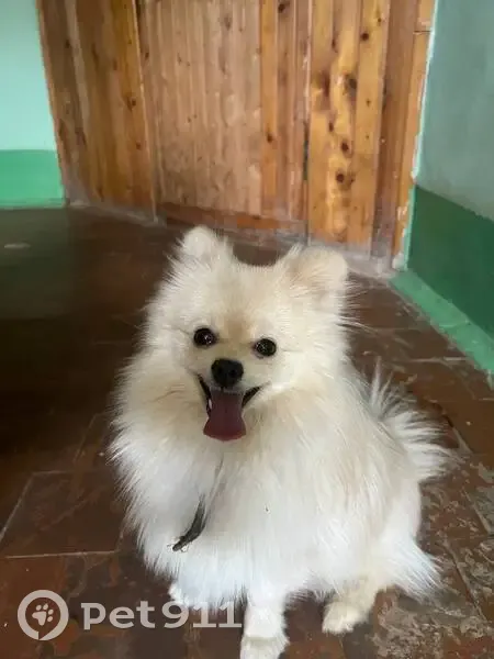 шпиц светлого окраса, около 14:00 забежал в подъезд вслед за ребенком. Поначалу собака была агрессивно настроена и не давала к себе приблизиться, но после успокоилась.