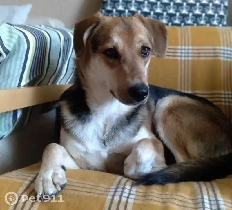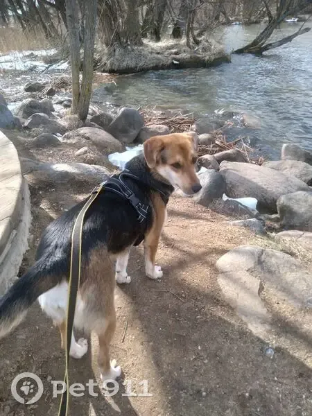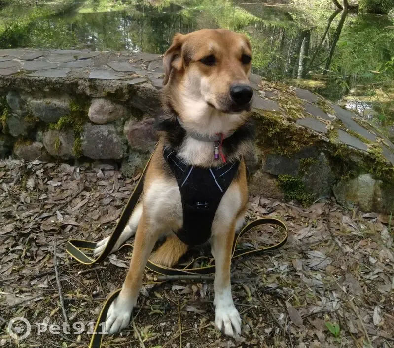Среднего размера (чуть больше 20 кг), похожа на гончую. Вислоухая. Мордочка рыжая, глаза обведены черным. Спина черная, лапы бежевые. На левой передней лапе маленькие бежевые пятнышки. Около 22 часов гуляли на закрытой собачьей площадке на стадионе. Начался очень громкий салют, собака впала в панику, заметалась, проскользнула сквозь прутья ограды и убежала. Удержать не удалось. На ней были черная шлейка (почти жилетка) с белой светоотражающей строчкой, ярко-голубой ошейник с медальоном-адресником в виде косточки и серый ошейник от блох и клещей.