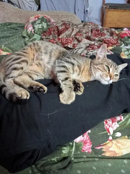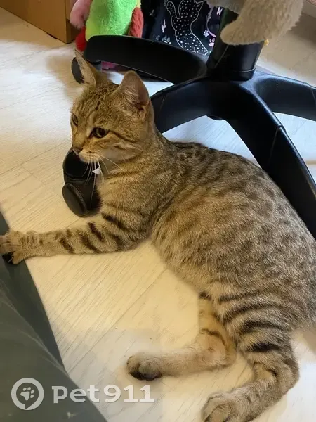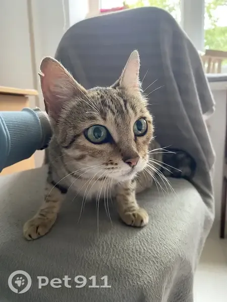 Молодая беременная кошечка. Окрас - полосатая с пятнышками, песочно-серого цвета, ярко-зеленые выразительные глаза. Похоже, что ей не больше года, совсем ещё маленькая. Ищем хозяев, если потерялась, или того, кто может приютить ее и будущих котят. Найдена около дома на Братской, 12, Юбилейный. Людей не боится, хотя сначала пыталась убежать. Очень ласковая, с лотком быстро разобралась.