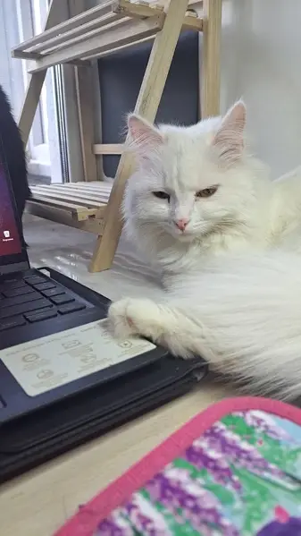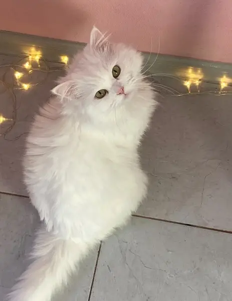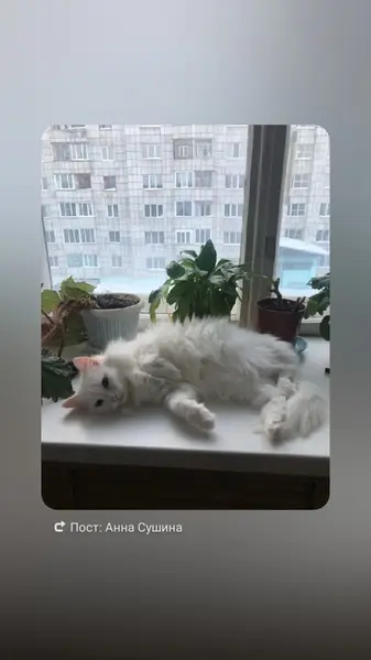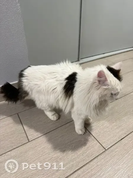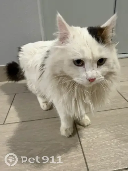Белый пушистый кот, длинная шерсть, тёмно-коричневый хвост, есть тёмное пятно на голове. Очень тактильный, мурчит, когда видит человека. Сидел на лестнице на улице, увидел и побежал сразу на руки.