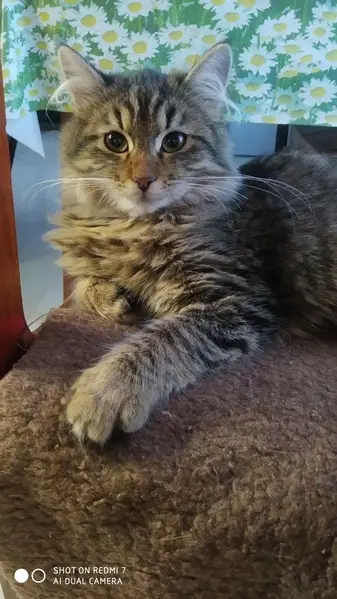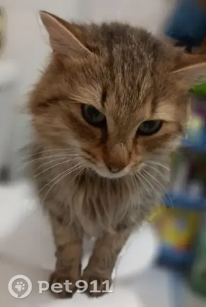 Полосатый окрас, пушистая, зеленоглазая. Бегала около крыльца 4 подьезда по ул. ЛЬВА ЛАВРОВА 14. На следующий день бегала голодная по подьезду. Кошка дружелюбная, идет к людям, кушает все, лоток знает на "отлично".