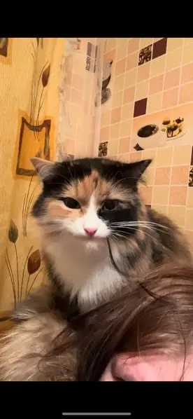 Найдена в подъезде. Очень красивая кошечка, богатка, чистая, ухоженная, шерсть не спутанная, похоже домашняя. Не крупная (на вид не больше года). Людей не боится, но в целом напугана и замёрзла. Похоже ранее на улице не бывала.