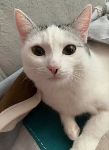 Упитанный котик, очень ласковый. Живёт сейчас в подъезде, забрать его не могу( Передержка, новый хозяин, старый хозяин заберите лапку, пожалуйста. Зелёный глаза, розовый носик, белый мех с пятнами серого окраса в полоску.