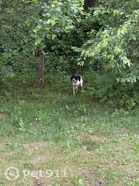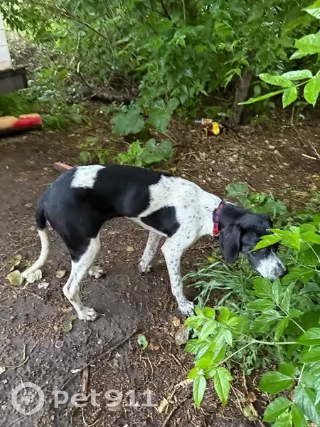 Собака породы Английский пойтер, молодая девочка 9-11 месяцев. Клейма нет. Ошейник красно синий с лапками. Есть чип, но данных о хозяевах нет в базах никаких. Собака ездили в машине, знает что это такое. Очень пугливая, но доверилась.
