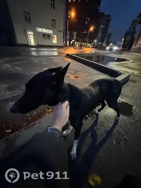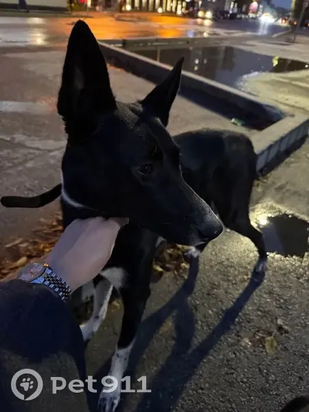 Бегает по улицам, похожа на потеряшку В ошейнике, но контактов нет На вид молодая, неагрессивная, очень красивая Черный окрас, белые лапы, большие стоячие уши