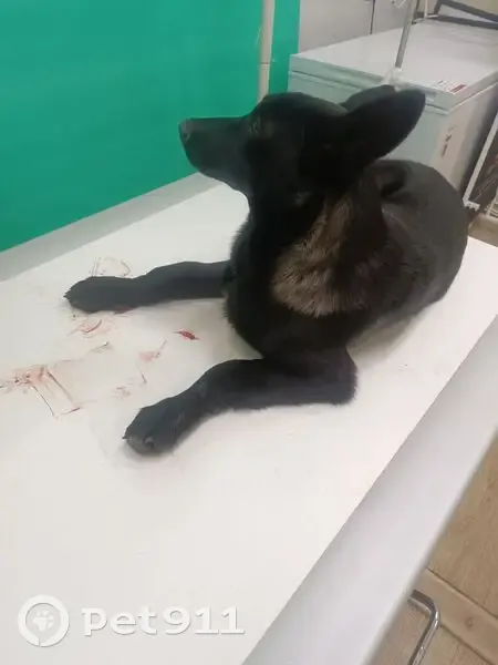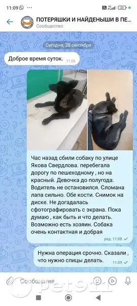 Черная, девочка, примерно пол года. Перебегала дорогу по пешеходному переходу и её сбила машина. Сломана лапа, больше других травм нет. Собачка очень контактная, добрая