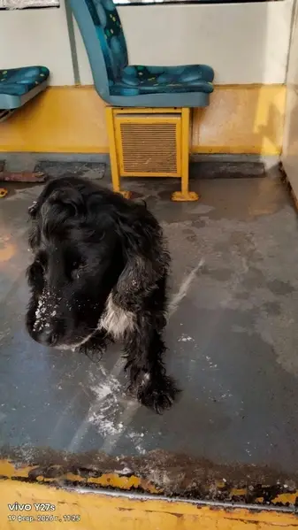 Собака небольшого размера, длинная кудрявая шерсть, черная с белыми лапками и грудкой. На собаке был черный кожаный ошейник и классический зеленый поводок. Собака пробегала мимо магазина (пятерочка, район Гайва) с поводком по земле, я проследовала за собакой в сторону парка Чехова, убедившись, что он без хозяина, поймала его, сейчас он у меня дома и очень скучает по хозяеву.