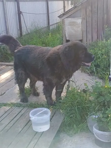 Черная собака, дезориентация, наклоняет голову, зелёный ошейник с карабином
