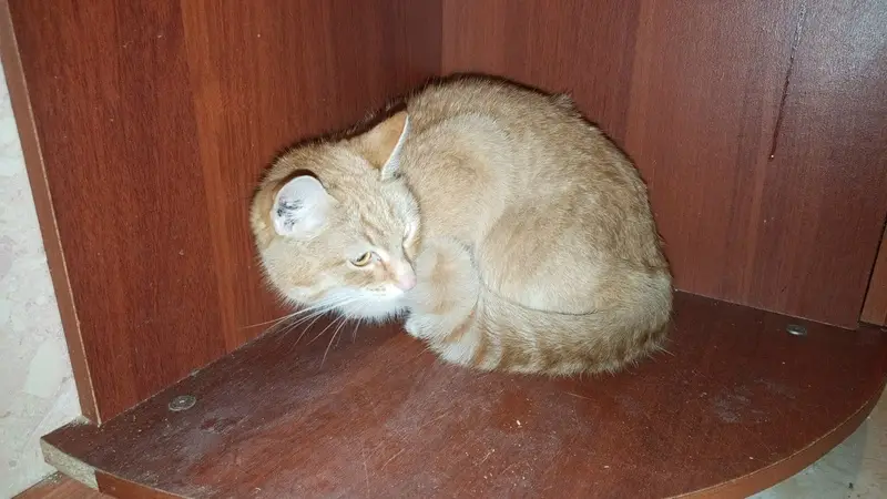 Рыжий кот, с белыми пятнами, хвост на конце белый, конец хвоста буквой «г», на носу черные точки, на белом животе шрам от операции, без ошейника