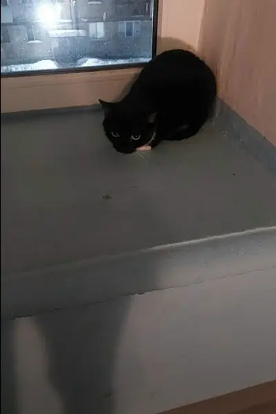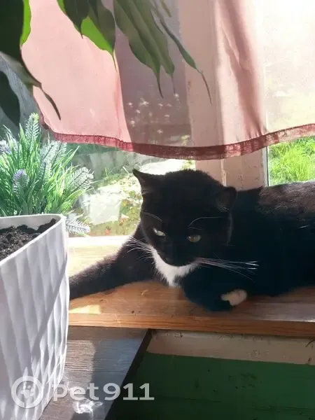 Шерсть короткая черная, белые лапы, живот, грудка и усы. Глаза зеленые. Незаметно ушла на улицу, ушла за ограду и не вернулась, пока нас целый день не было дома.