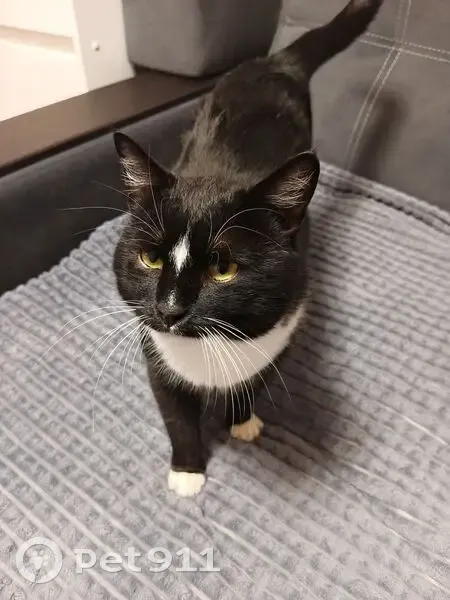 Черная спинка, живот белый, также белые усы и лапки. Кот добрый, на улице недавно