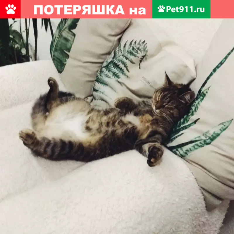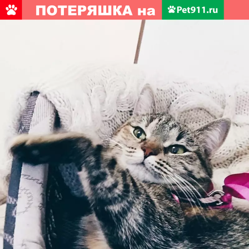 Кошка трехшерстная, полосатая с небольшим белым пятном на грудке и животике. Откликается на "Матрешка". Была в черном ошейнике - на нем должен быть номер телефона и адрес. Район Пушкина, 23, 25, 27 и луначарского 51.