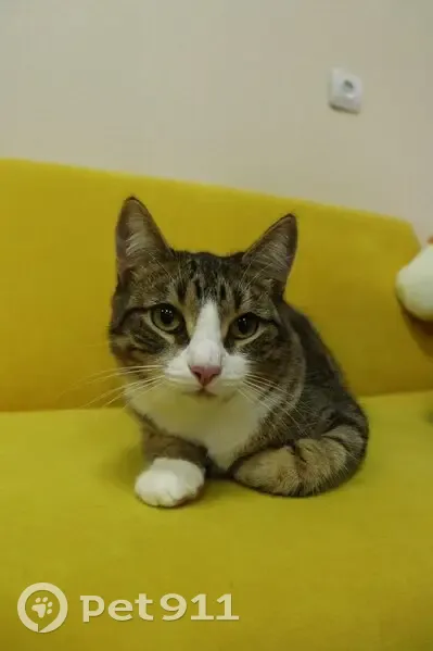 Коричнево-серый окрас. Кончики лап и мордочка белые, розовый нос. Кастрирован. Обычно ласковый, но может быть пуглив из-за стресса. Может не откликаться на имя.