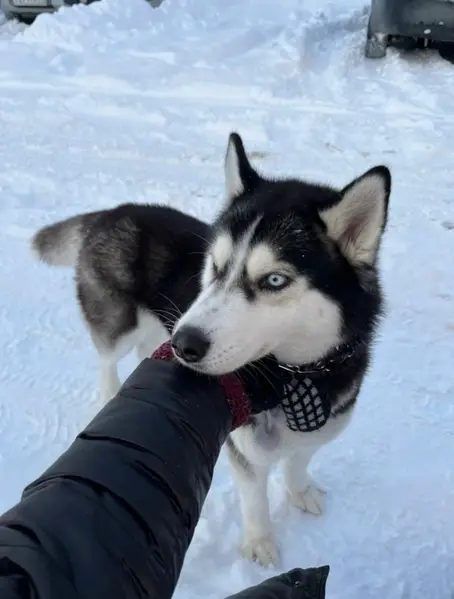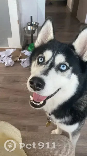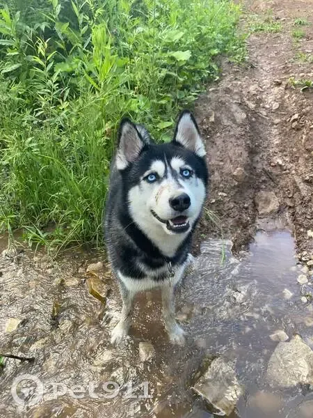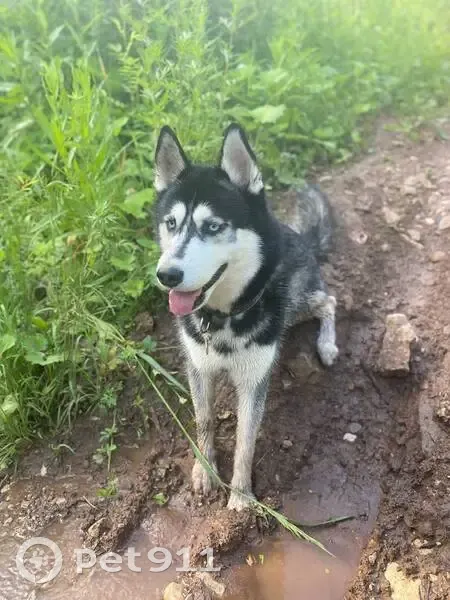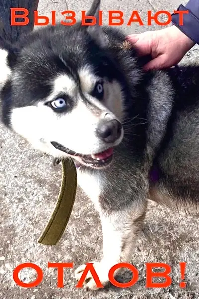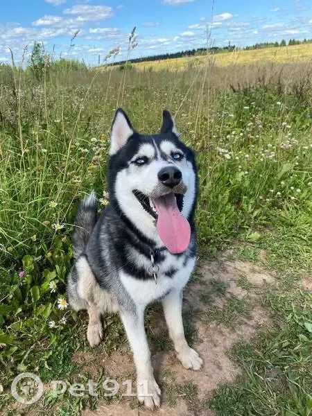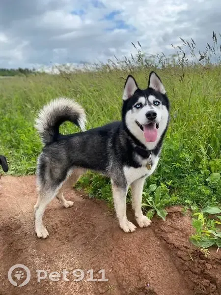 Крупный кобель породы хаски, ласковый, дружелюбный, в синем ошейнике с адресником. На адреснике есть номера телефонов. Особенность: бегает с языком на бок)