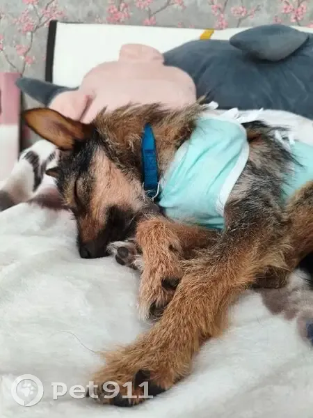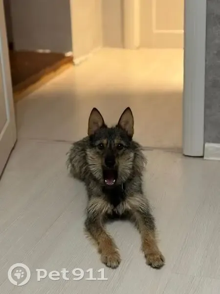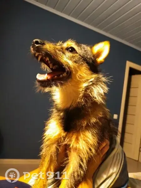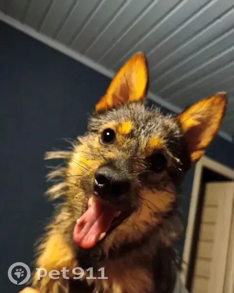 Маленькая собака, размером с кошку. Шерсть длинная, жесткая, окрас как к енота - черный с серым и белым. На шее голубой ошейник с круглым адресником. Ушла лесом со стороны Новобродовского по направлению к Горному.
