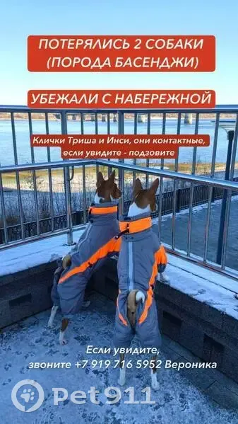Две собаки породы басенджи. Убежали сегодня на набережной. На них были комбинезоны. Зовут Инси и Триша. Побежали за утками. Могли провалиться под лед. Добрые и контактные! Придержите, если увидите – сразу заберем! Вероника 89197165952 Татьяна 89125954906 vk. Com/hlopushka_lubyatova #потеряшкипермь