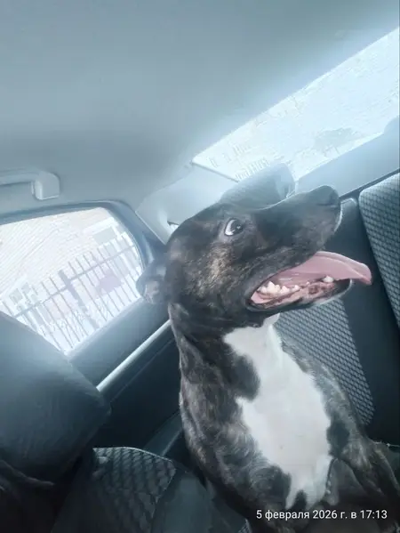 Сорвался с поводка. Стафф бежит в сторону островского. Пёс не конфликтный добрый. Помогите найти, поймать собаку. Он член семьи дети плачут. Кличка Мартин.телефон .