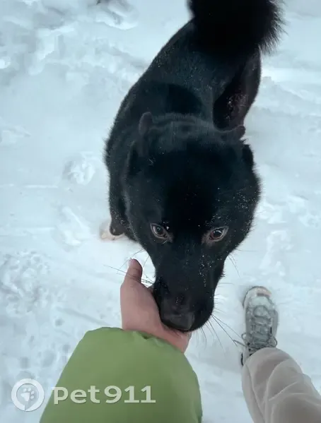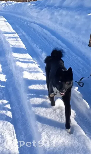Кобель черно белый. Меньше двух лет. Откликается на кличку Грей. Зеленый брезентовый ошейник. Лайка. Морда черная грудка и животик белые, белые носочки