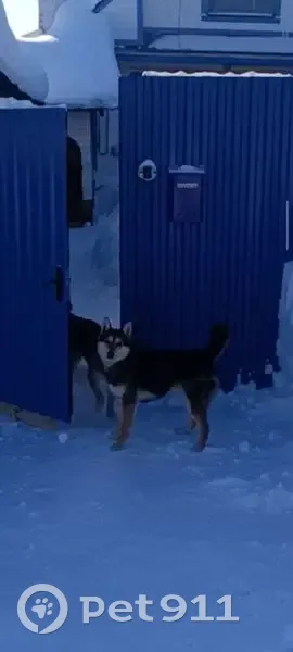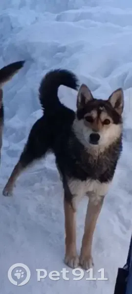 Чёрная спина, светлая мордочка и лапки, среднего роста, смесь между лайкой и беспородной собакой, добрый и ласковый. Может лаять на других собак. Убежал ночью по куче снега через забор.