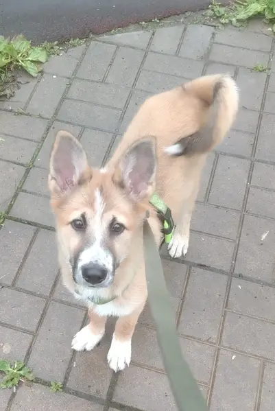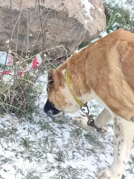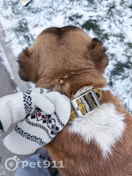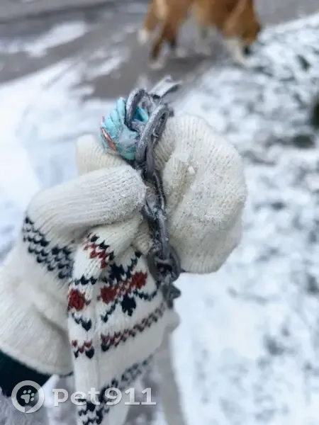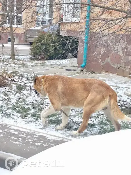 Поселок Первомайское. Бродит и что-то ищет. С длинной цепью, желтый ошейник с черной строчкой. Адресника нет. Спокойный, не реагирует на людей. Но и не особо подходит, первое время не давал подходить, уходил. Ушки видимо купированные. Чей пес?