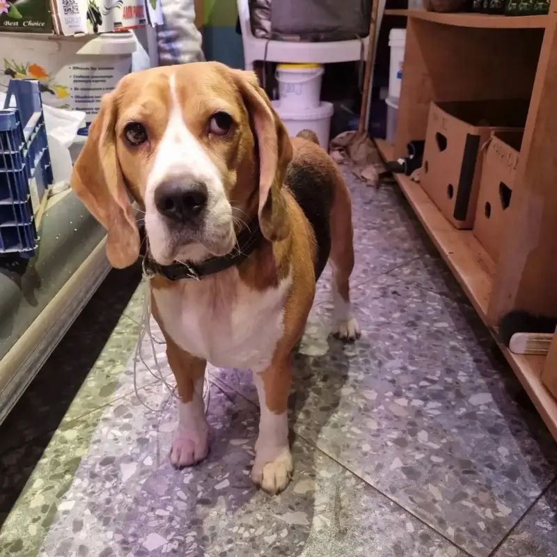 Джой бегал в окрестностях поселка , на шее ошейник. Звонко лает. Спина и хвост черные, кончик хвоста белый; лапы белые; грудь белая, на груди рисунок в виде листка рыжего цвета, голова рыжая с белым пятном; в паху клеймо 4000. Собака чипована.