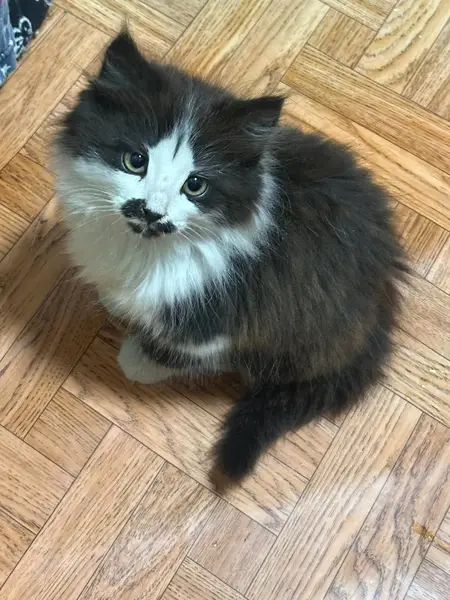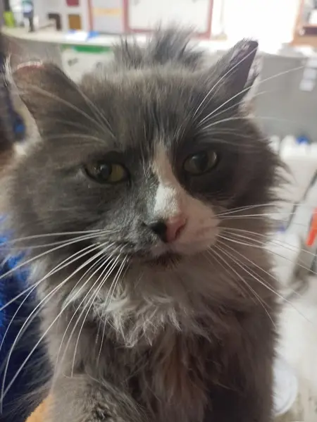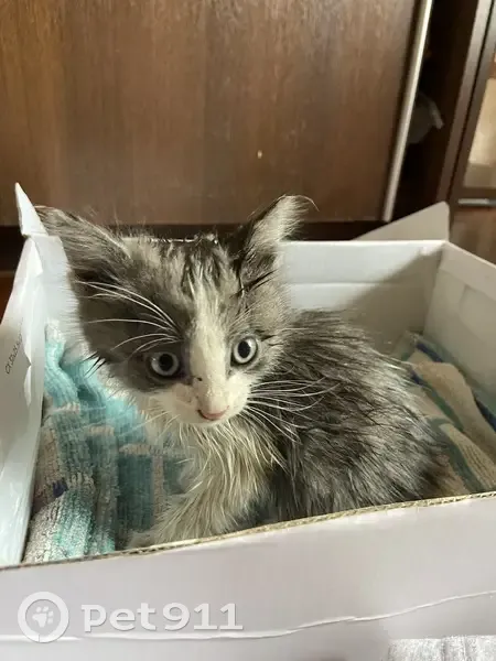 Кот был найден в машине соседей в моторе. Доставали всем двором. Ели как достали, я забрала его к себе на передержку. Помыла, накормила. Глазки голубенькие, серо белый окрас, сам по себе очень ласковый. Блох вроде бы нет.