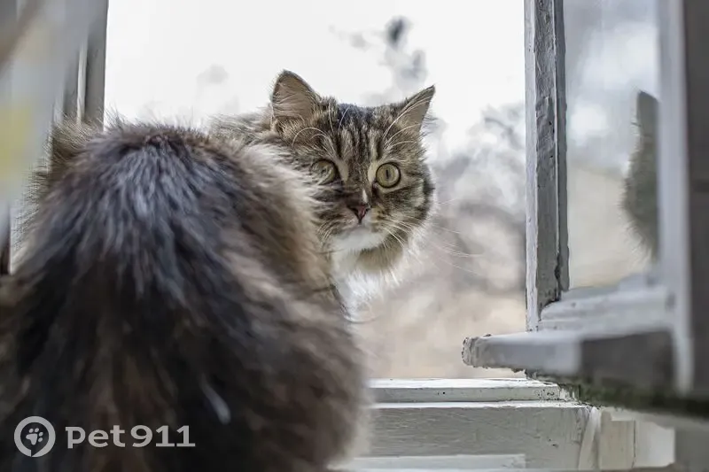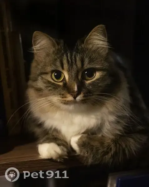 Серая кошка с чёрными полосками на спине, белыми лапками и шеей. Кошка пугливая, домашняя, не стерилизованная, при нахождении в незнакомом месте прижимается к земле. Выбежала в подъезд, соседка снизу вышвырнула кошку на улицу. Пару лет назад выводили кошку на улицу посмотреть на поведение - пыталась сразу бежать в подвал.