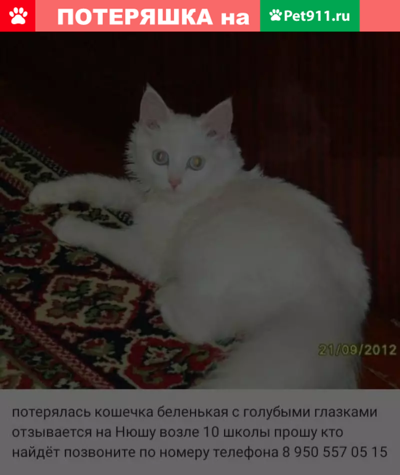 Первоуральск в районе десятой школы Пропала беленькая пушистая кошечка с голубыми глазками худенькая очень красивенькая кто нашёл позвоните по номеру телефона домашняя любимица ребёнок очень скучает