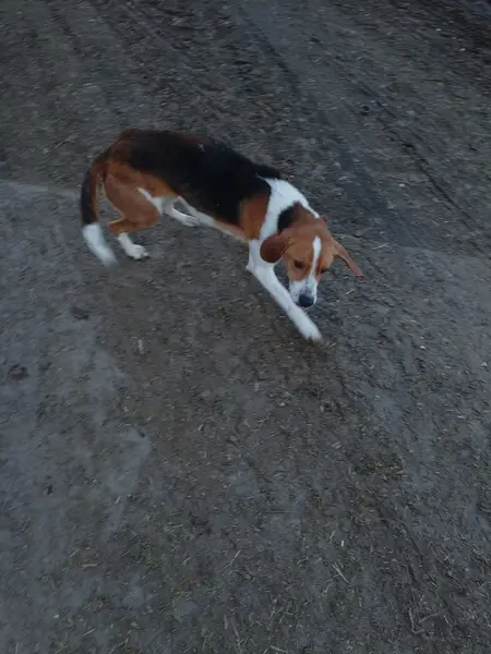 Собака (кобель) подошла к нам, когда мы гуляли, в районе фермы. Скорее всего, охотничья, породистая. Она без ошейника, видно, что домашняя, доброжелательная. Сопровождала нас во время всей прогулки.