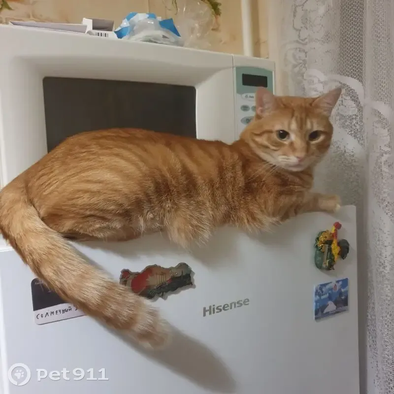 Крупный красивый кот, рыжий с полосками без белых пятен, хвост персиковый, в черном ошейнике. Очень активный, капризный, выбрался в окно. К посторонним осторожен, боится шума, но в целом ладит с людьми, любит орать на людей и царапаться.