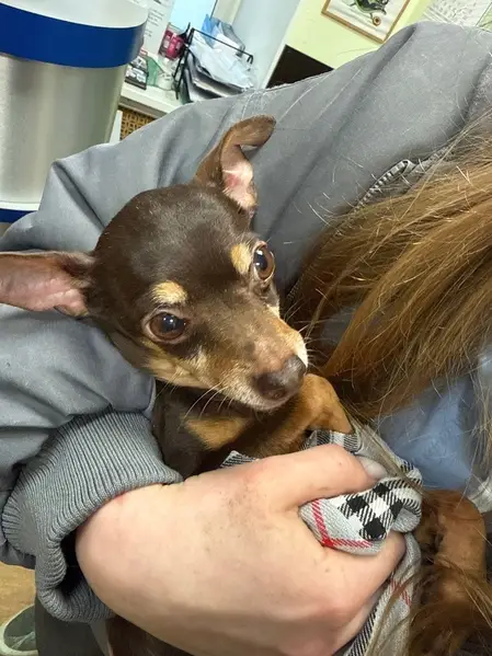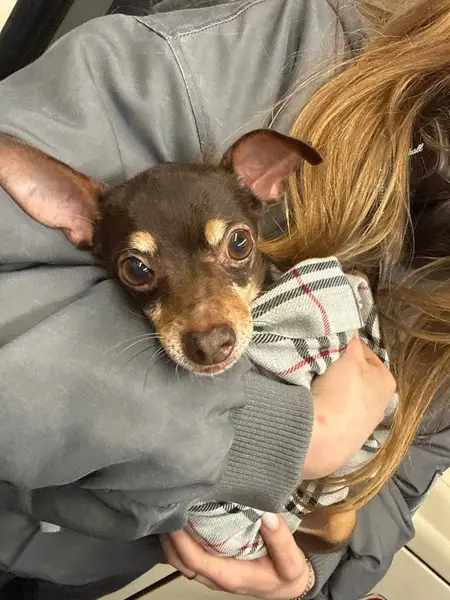 Порода Чихуахуа, коричневая, в руки может не даваться. Боится шума. Выбежала из подъезда без поводка и ошейника