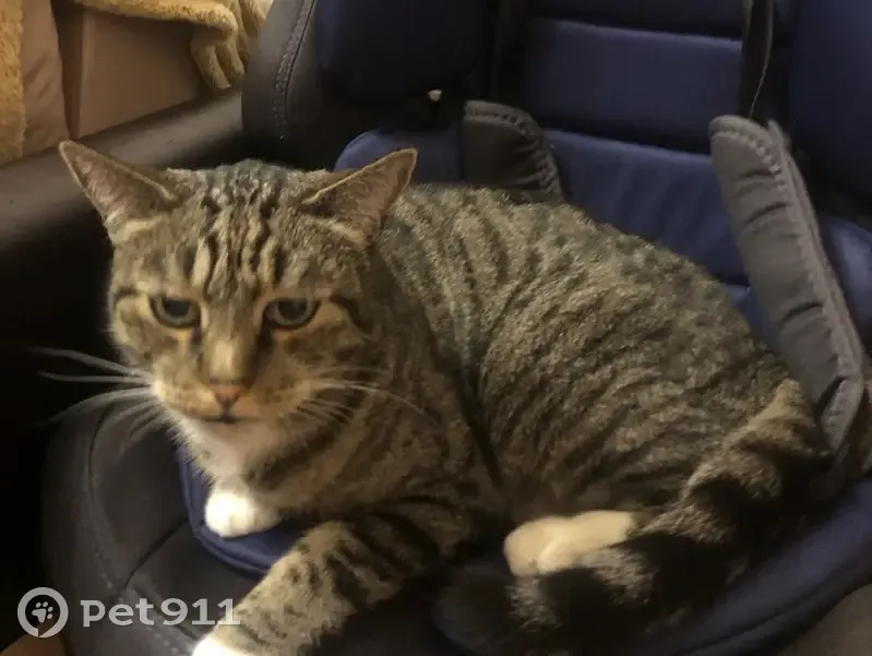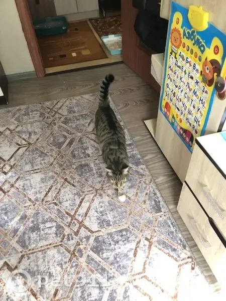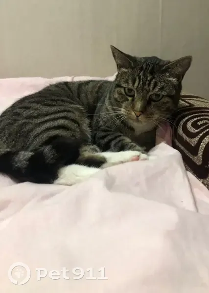 Найден кот в подъезде на ул. Державина, дом 35. Ухоженный, домашний. Очень боится улицу. Отвезли к ветеринару. Кот кастрирован, около 10 лет. Обработали от блох и гельминтов. На носу у кота белая полоска.
