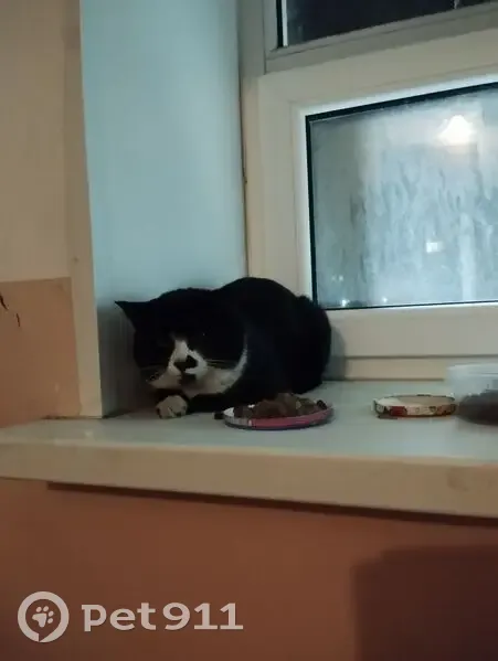 Людей боится. Упитанный. Черная спина, грудка белая, белые снизу лапки, на мордочке белое пятно, а в нем маленькое черное, нос черный. Забежал утром в подъезд, сидит на подоконнике, обложенный мисками, не ест, к рукам не идет, дрожит при приближении человека.