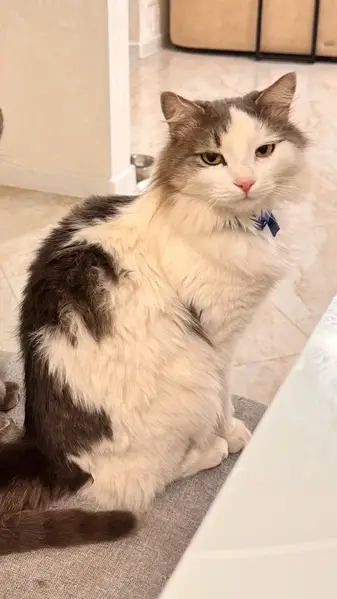 28 января кота нашли другие люди на улице Боровая 2, запустили в подъезд. Спустя 2 дня взяла себе на передержку Кот ласковый, кастрированный, точно домашний. Из особенностей: нет одного клыка. Помогите найти хозяев