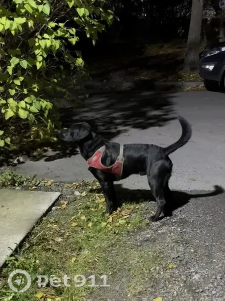 Черный лабрадор-мальчик, на вид юный, в красно-серой шлейке, бегает в районе центра по дворам Антикайнена-Анохина-Горького, в каждом встречном ищет хозяина; активный и дружелюбный
