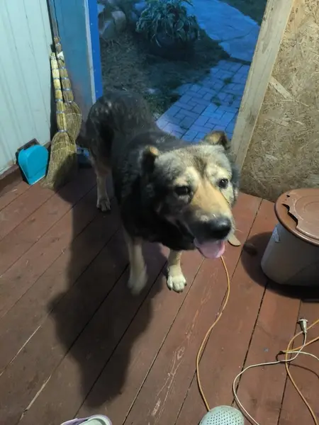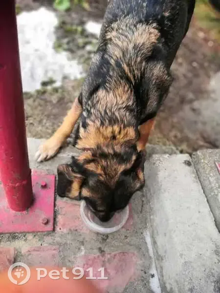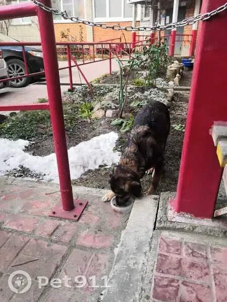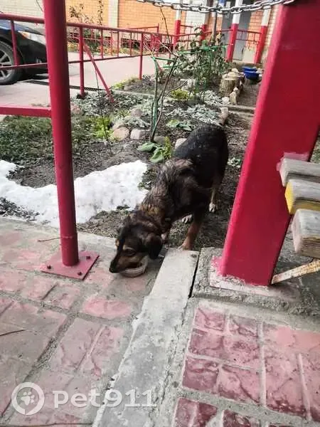 Окрас от коричневого до темно коричневого цвета. Вроде девочка, боязливая в руки не даётся. Есть ошейник. Собака скорее всего домашняя, чистая. С утра сидит во дворе по улице Промышленная.