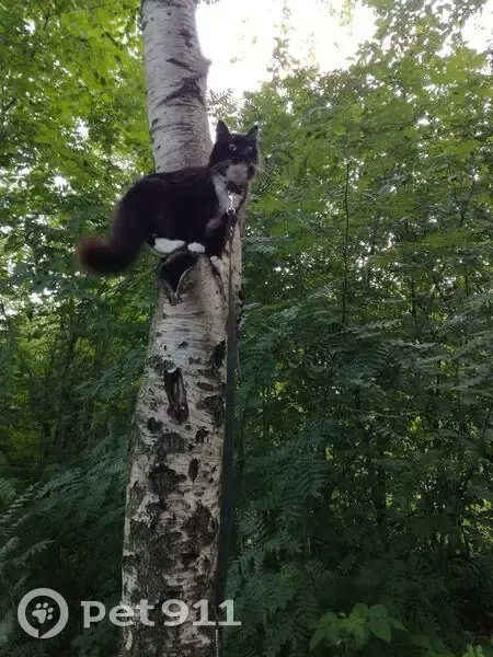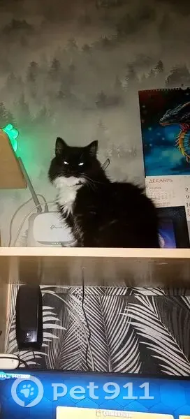 Чёрно белая (ей 8 лет), Сама чёрная,белый галстук на груди и белые лапки,как сапожки. Кошка домашняя,может боятся улицы. Пошли выносить мусор и она убежала..