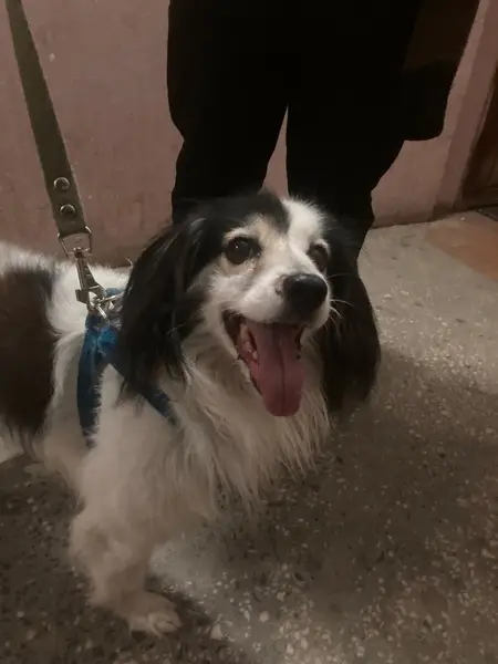Белый с черными пятнами , маленькая, старенькая 16 лет, плохо слышит и видит