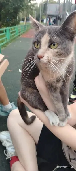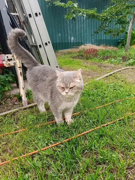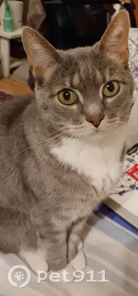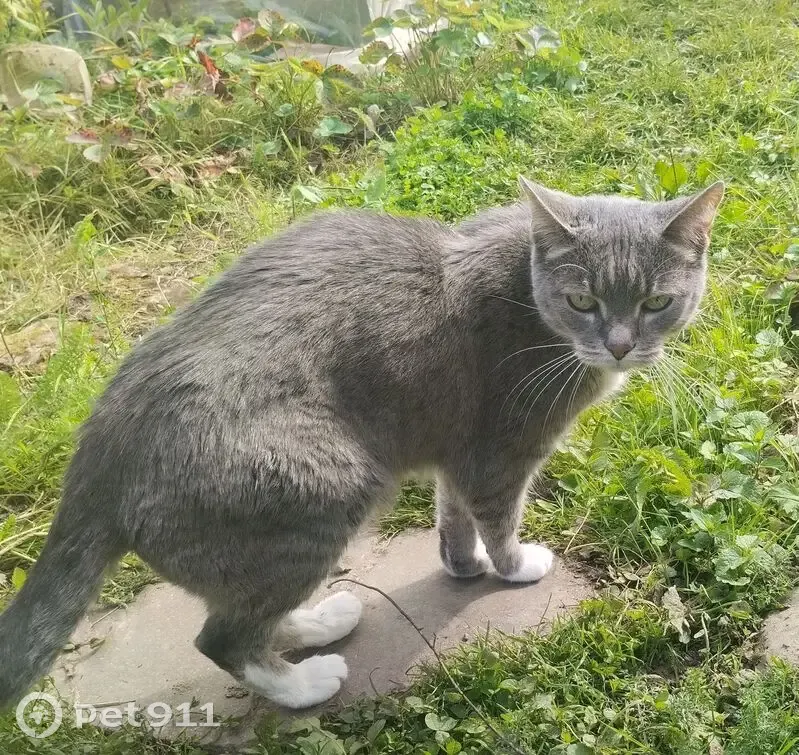 Серый с белой грудкой и носочками. Худенький, на хвосте и лапках полоски. На брюшке имеется шишка размером с небольшой грецкий орех. 15 лет. Робкий, совсем неагрессивный котик . Просто ушел как обычно погулять и не вернулся Кастрированный, чипированный