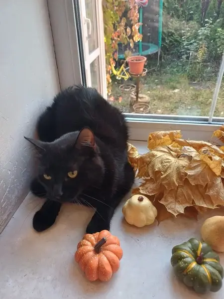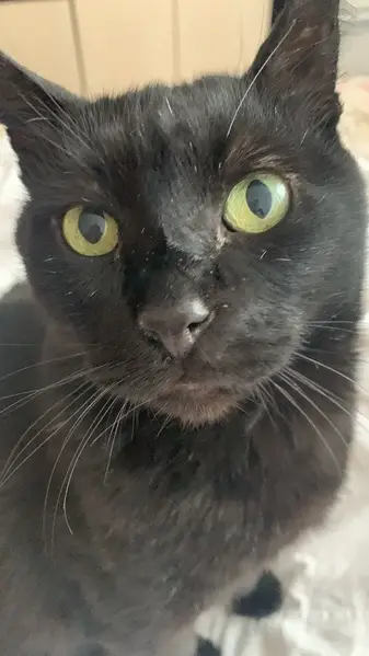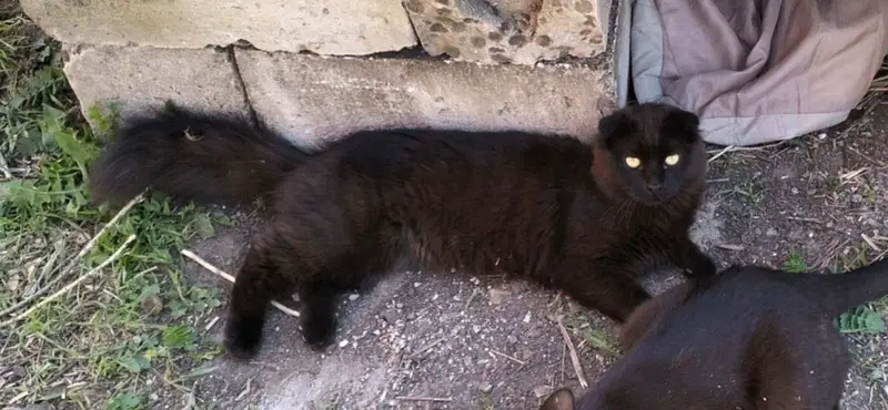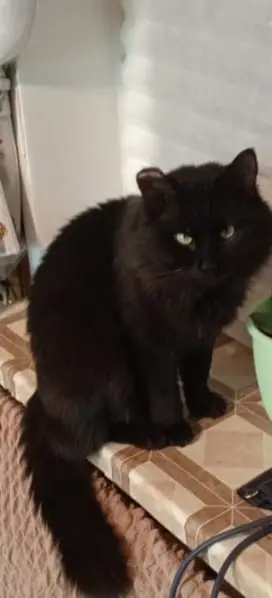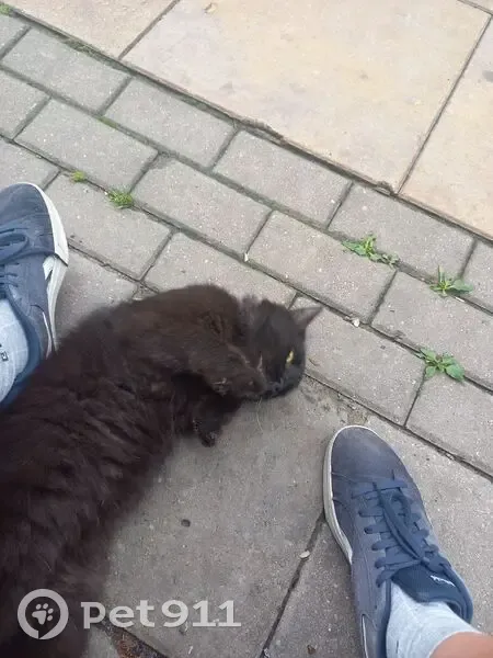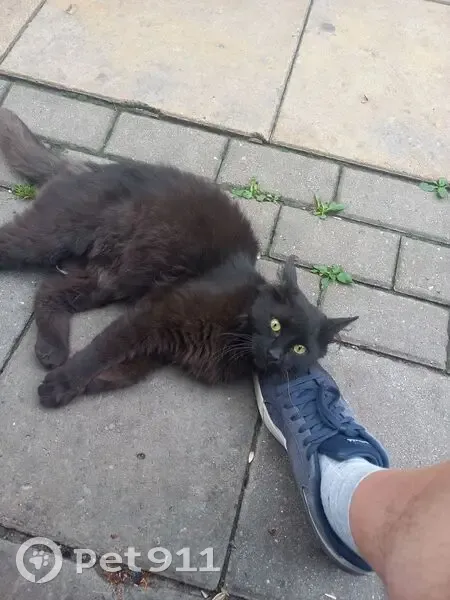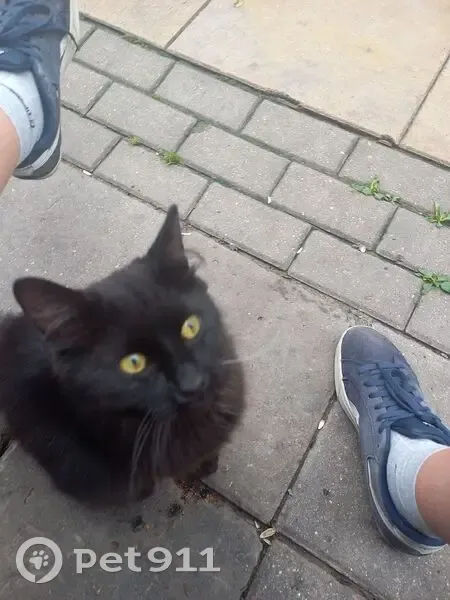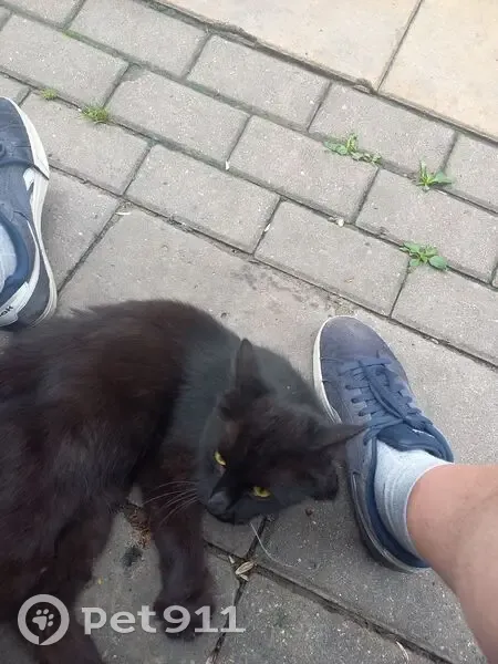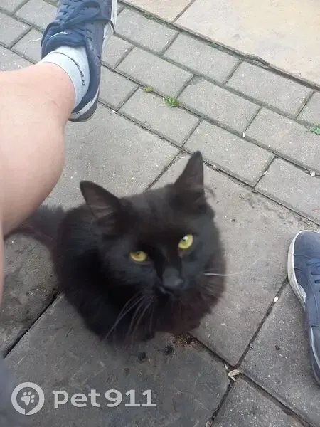 Чёрный,жёлтые глаза,приветливый,видно домашний,особые приметы один белый ус,с левой стороны